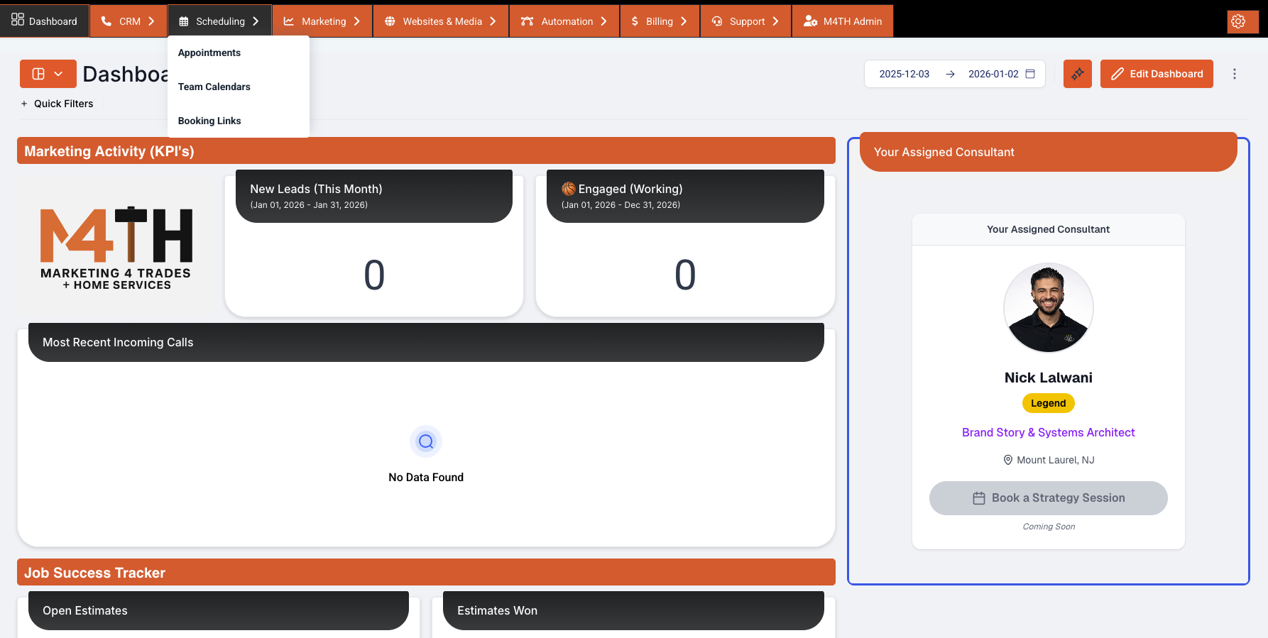 Example: M4TH dashboard showing the consultant widget alongside KPIs and tracking metrics