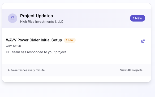 Example: Project updates widget showing "WAVV Power Dialer Initial Setup" notification with auto-refresh functionality